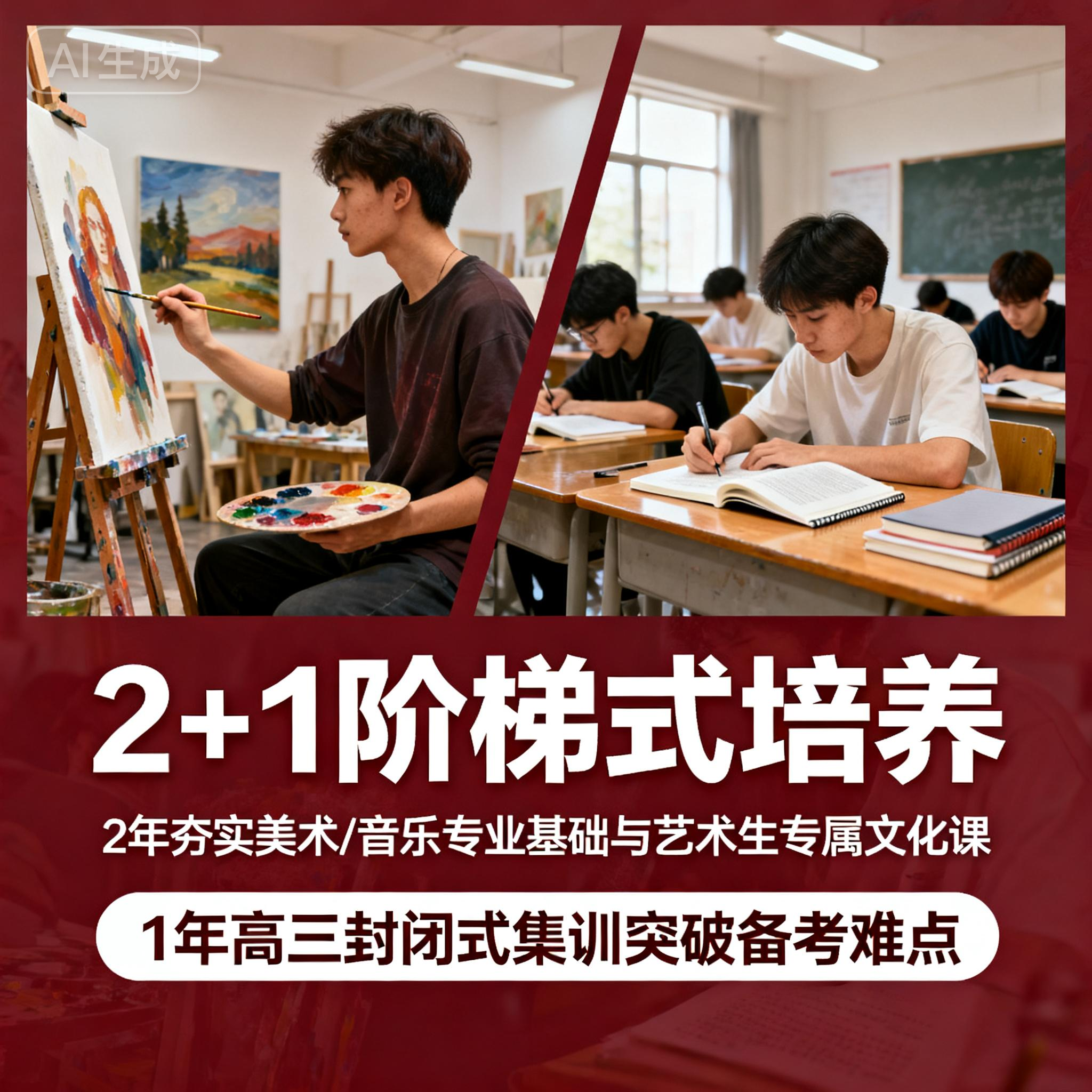 采用“2+1”阶梯式培养模式,两年夯实美术 /音乐专业基础与艺术生专属文化课,一年高三封闭式集训突破备考难点,科学分配学习周期。